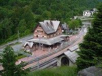 Costruita come tutte le stazioni del tratto montano della ferrovia secondo il progetto dell'ing. Scotti nel 1915, è un edificio di tre piani in muratura e cemento armato con tetto a falde in legno e copertura, rifatta, nei primi anni del XXI secolo, in lose.