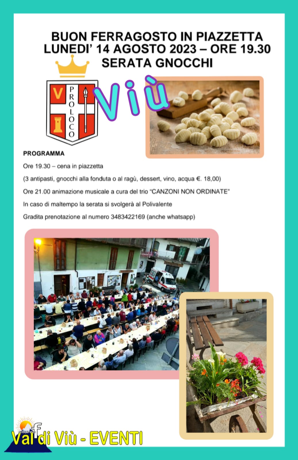 • Ore 19:30: Cena in piazzetta (tre antipasti, gnocchi alla fonduta o al ragù, dessert, vino e acqua € 18,00)