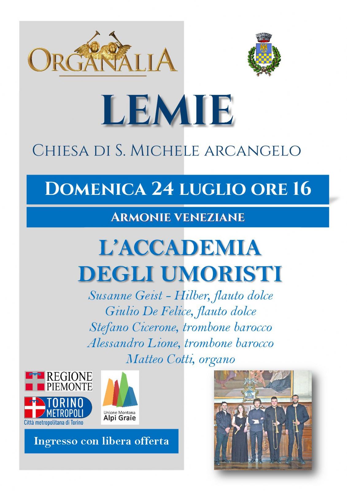 Il concerto si avvale del sostegno del Comune di Lemie in collaborazione con l'Unione Alpi Graie.