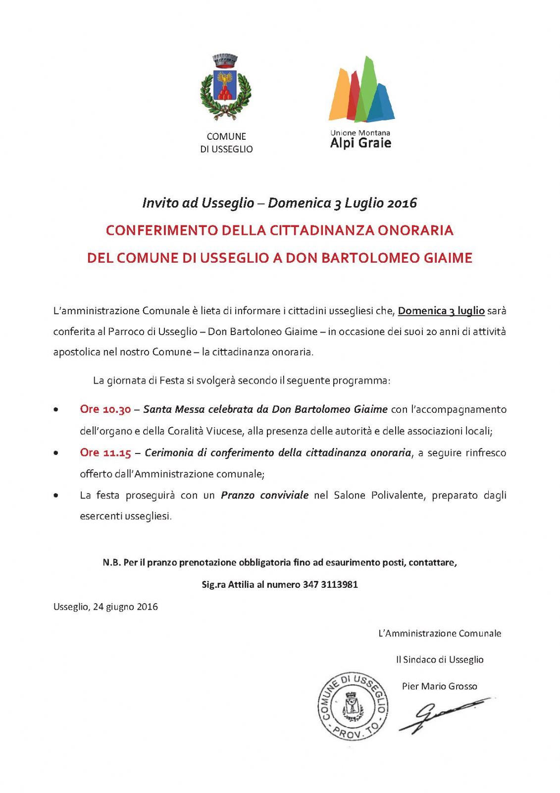 CONFERIMENTO DELLA CITTADINANZA ONORARIA DEL COMUNE DI USSEGLIO A DON BARTOLOMEO GIAIME