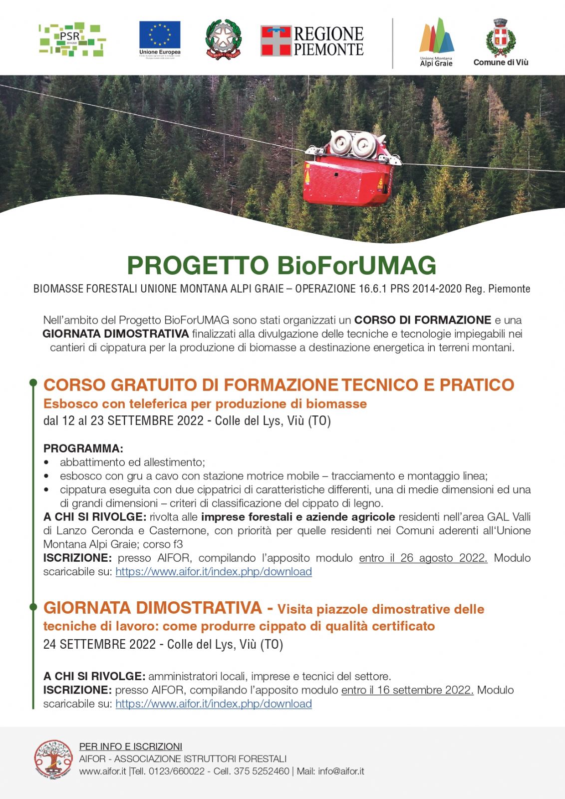 Il Corso "Esbosco con teleferica per produzione di biomasse" si svolgerà al Col del Lys, Viù (TO) e avrà la durata di 5 giorni. Sarà possibile scegliere il modulo che avrà luogo dal 12 al 17 settembre o il modulo che avrà luogo dall 19 al 23 settembre