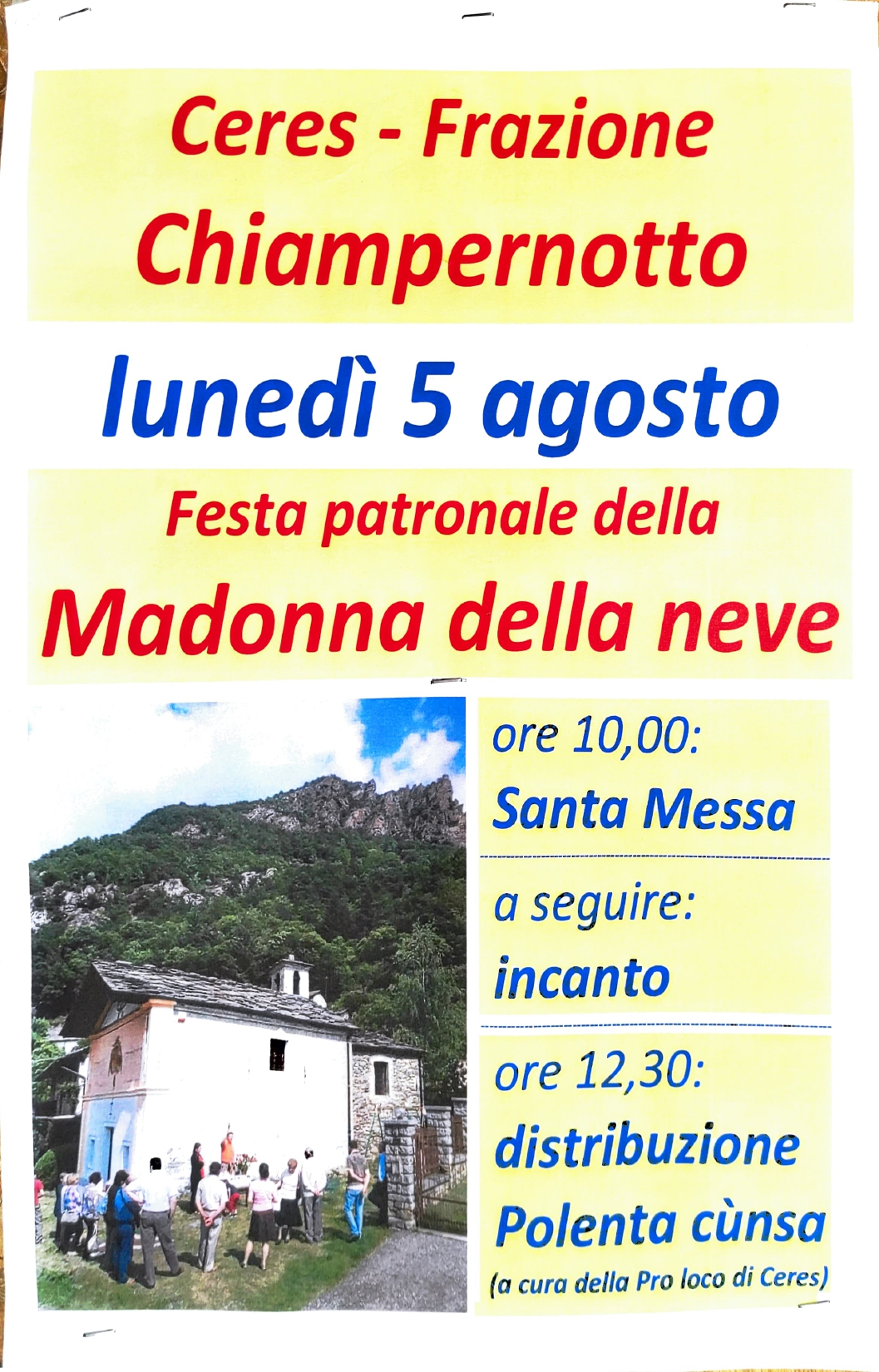 Lunedì 5 agosto la Pro Loco di Ceres organizza la "FESTA PATRONALE DELLA MADONNA DELLA NEVE"