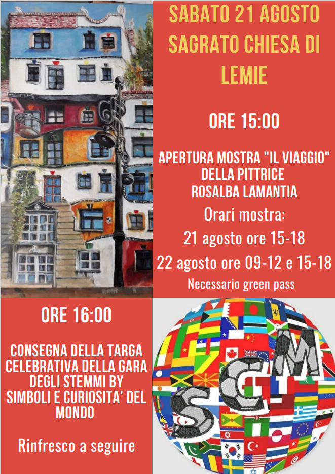 Ore 16:00, presso il sagrato della chiesa di Lemie, premiazione del comune di Lemie da parte della pagina facebook Simboli e curiosità del mondo con consegna della targa celebrativa come riconoscimento del comune più piccolo che ha ricevuto più voti nel concorso degli stemmi