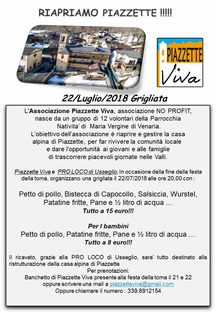 Piazzette Viva e l'Associazione Turistica Pro Loco Usseglio, in occasione della fine della 22^ Mostra Regionale della Toma di Lanzo e dei formaggi d'alpeggio, una grigliata il 22 luglio 2018 alle ore 20,00 con: