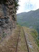 Da qui il percorso è sempre ben individuabile. Un primo tratto fra rade piante, poi un valloncello dopo il quale si passa in un fitto boschetto di ontani. Usciti, si perviene a un altro vallocello in cui il piano della ferrovia è stato completamente asportato da valanghe. C'è però una corda fissa e l'esposizione non è forte.