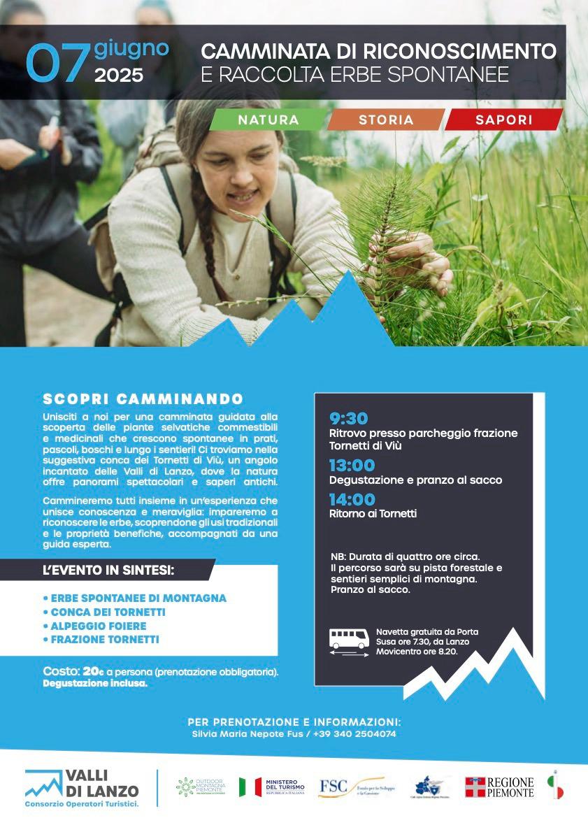 Camminata guidata alla scoperta delle piante selvatiche commestibili e medicinali presenti nel luogo suggestivo che è Tornetti di Viù, angolo incantato delle Valli di Lanzo, dove la natura offre panorami spettacolari e saperi antichi.