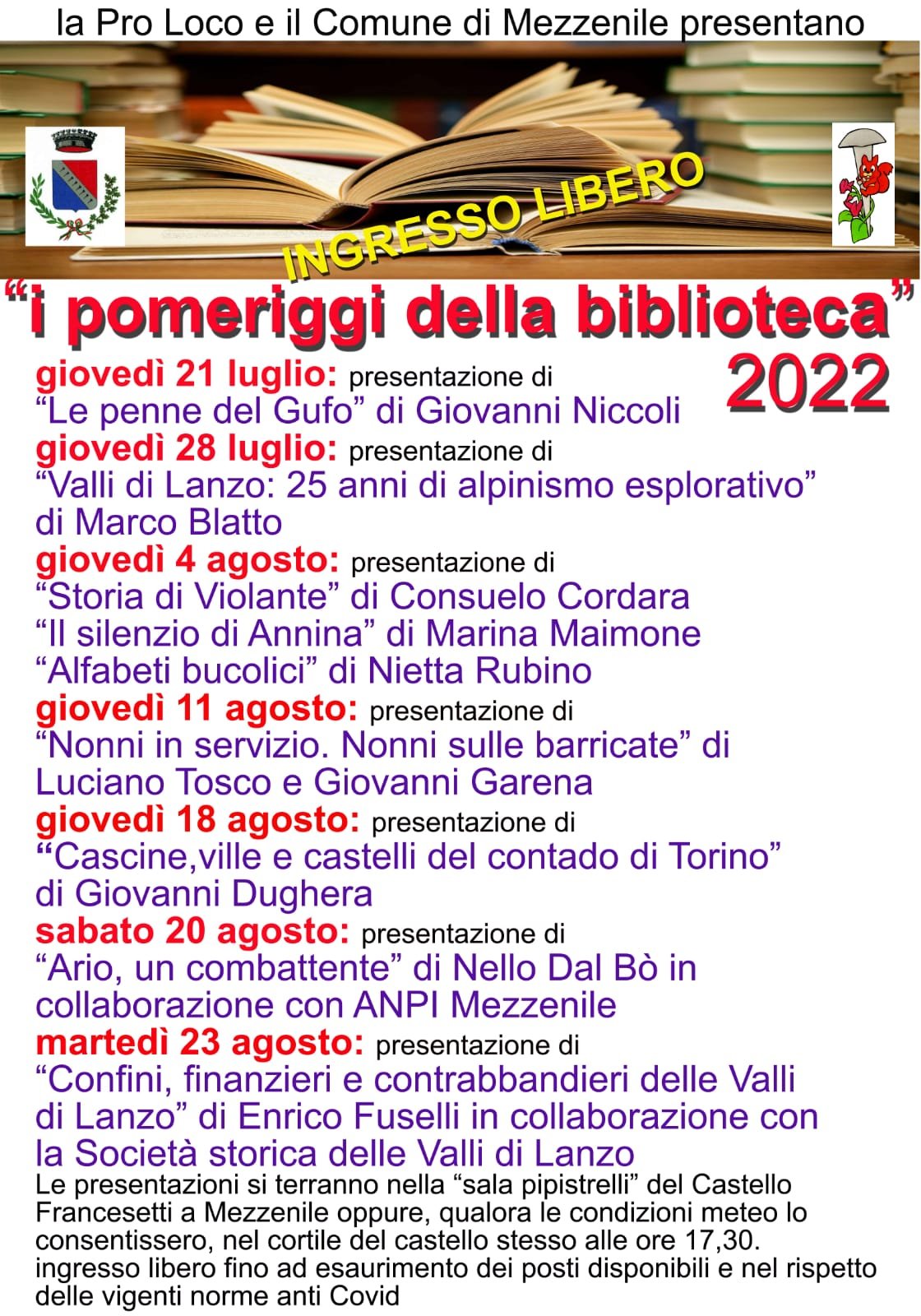 Ciclo di presentazioni di libri e incontri con gli autori presso la sala Pipistrelli del Castello Francesetti