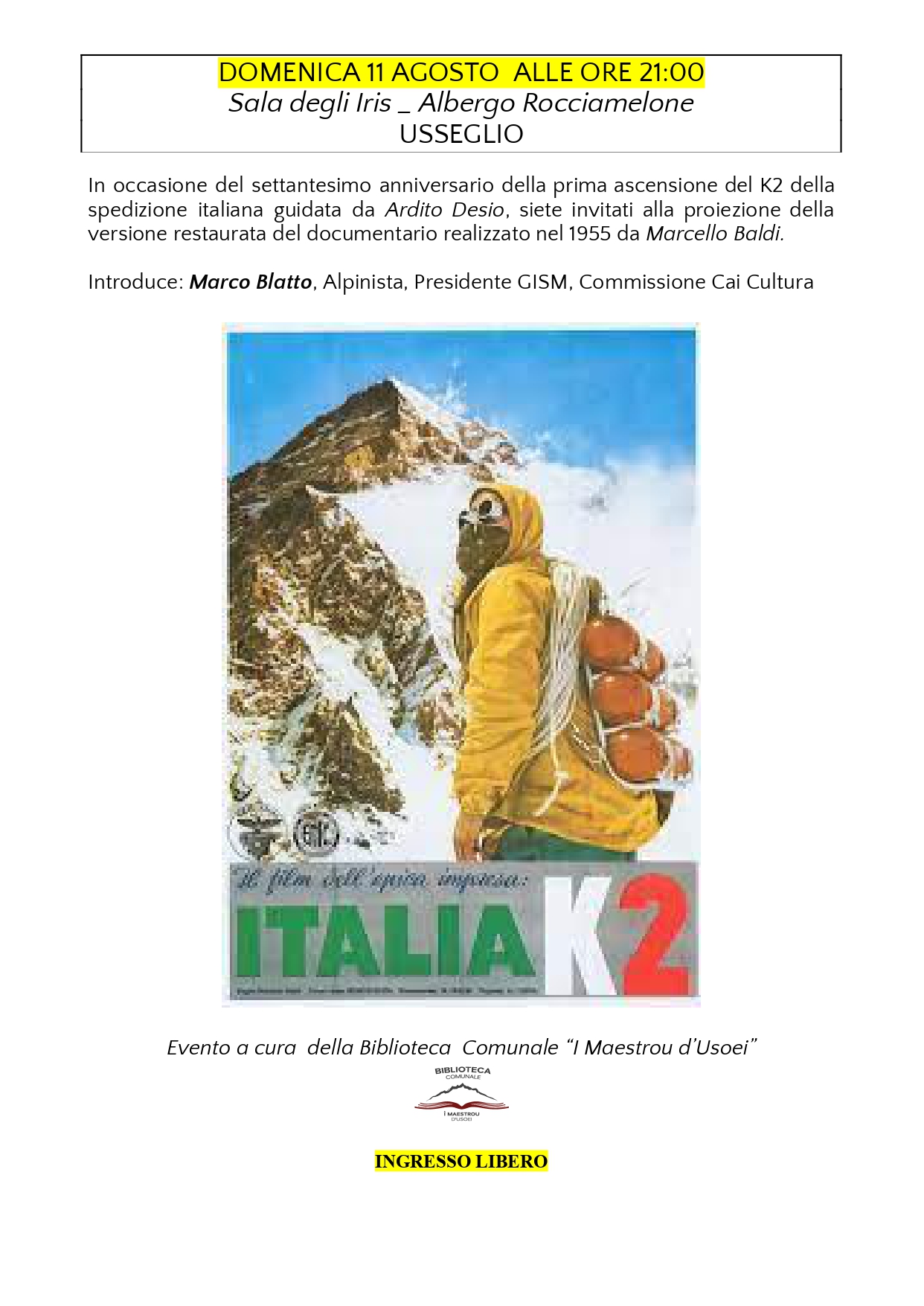 Domenica 11 agosto alle ore 21,00 in occasione del settantesimo anniversario della prima ascensione del K2 della spedizione italiana guidata da Ardito Desio verrà proiettata la versione restaurata del documentario del 1955 di Marcello Baldi.