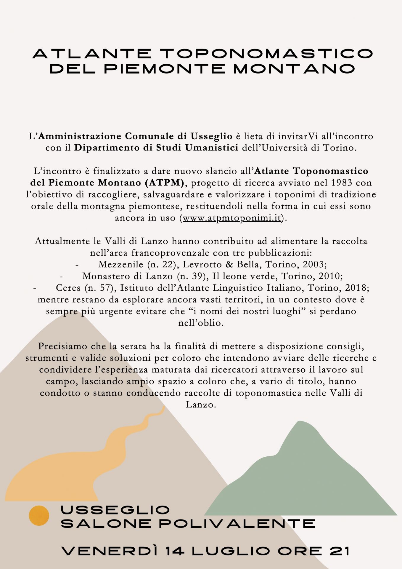 L’Amministrazione Comunale di Usseglio è lieta di invitarVi all’incontro con il Dipartimento di Studi Umanistici dell’Università di Torino che si terrà venerdì 14 luglio 2023 alle ore 21.00.