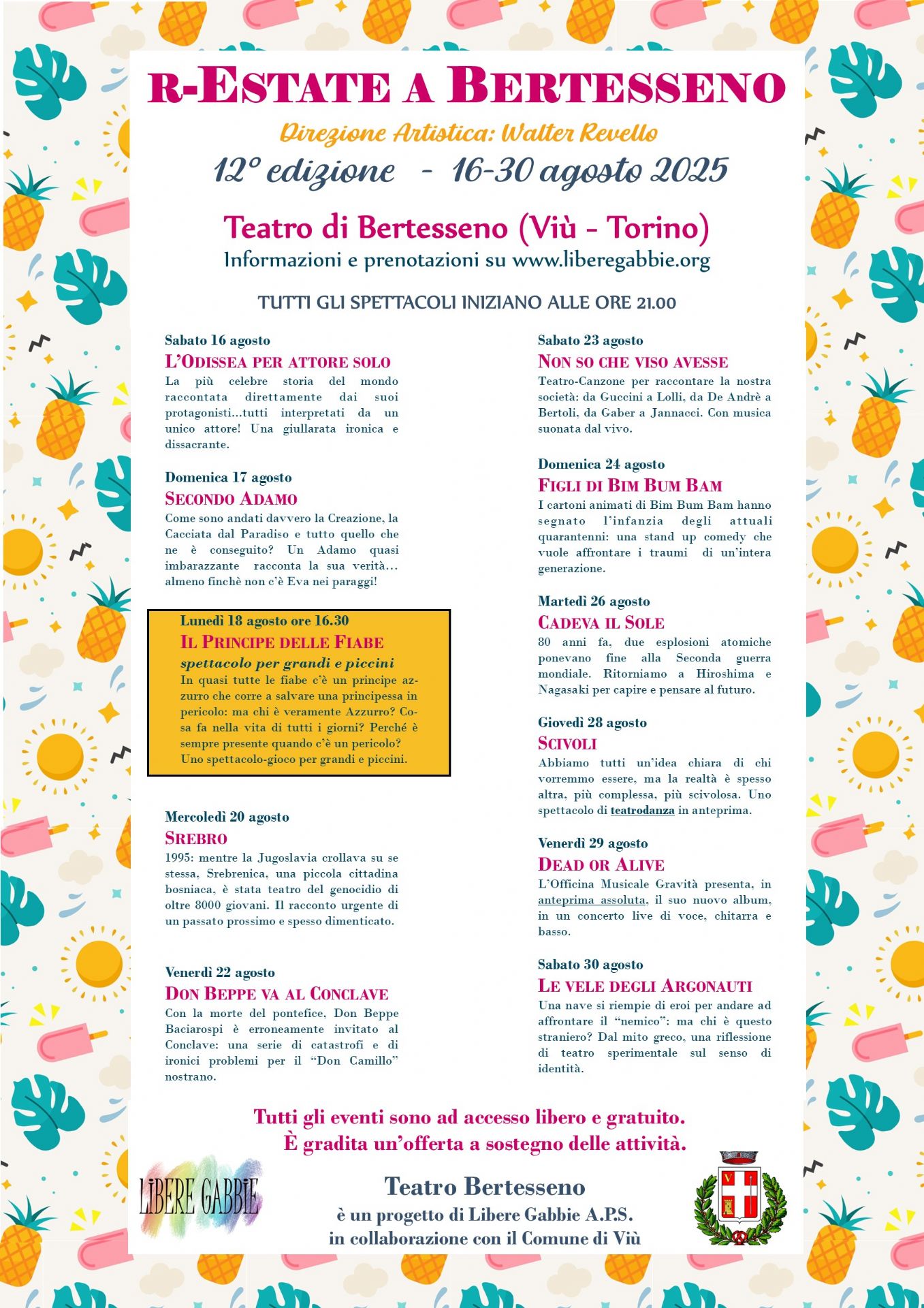 Tutti gli spettacoli iniziano alle 21:00 e sono ad ingresso libero e gratuito.