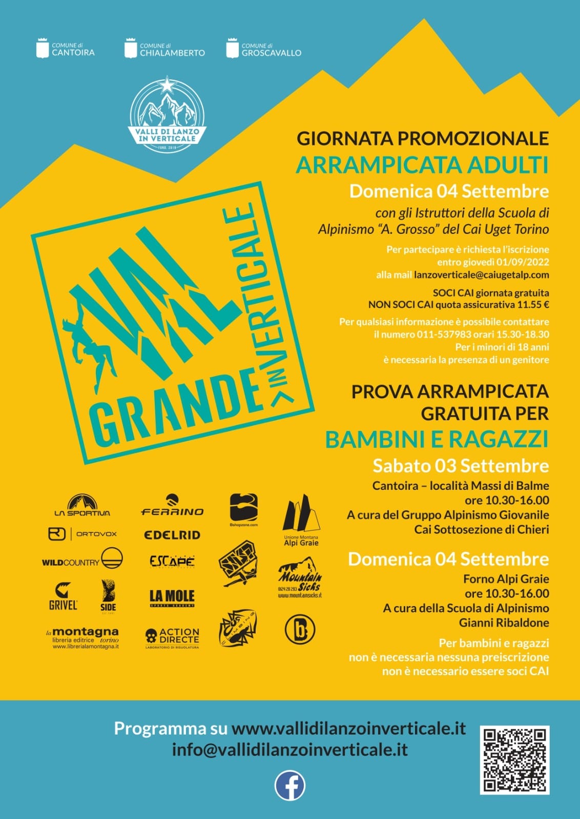 - A partire dalle ore 10.00 giornata promozionale di arrampicata rivolta agli adulti (maggiori di anni 16) presso imassi della frazione Balme di Cantoira. A cura della Scuola di Alpinismo “Alberto Grosso” del CAI Uget. Iscrizione obbligatoria entro giovedì 01/09 all’indirizzo e-mail lanzoverticale@caiugetalp.com. La giornata è totalmente gratuita per i SOCI CAI di qualsiasi Sezione,mentre per i NON soci CAI è richiesto il versamento anticipato della quota assicurativa pari a 11,55 euro. Per iminori di 18 anni è necessaria la presenza di un genitore. Informazioni sul sito www.caiuget.it