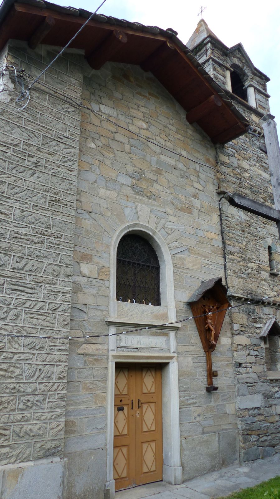 Nel 1932 fu rimessa a nuovo la facciata in pietra a vista e messo l’impianto della luce elettrica. Il campanile pure in pietra fu costruito nel 1938, anno in cui fu installato l’orologio. Anche il porticato laterale fu costruito in quell’anno, sempre grazie a vari benefattori, tra cui Cibrario Giovanotu e i tre fratelli Cibrario Gaudin. Alcune statue lignee ornano la chiesa: S. Rocco, la Madonna del Rosario e pregevole è il crocifisso con i segni della passione posto sopra l’altare. Vi sono inoltre alcuni grandi quadri, una statua dell’Addolorata e una di S. Giovanni Battista. Alcune iscrizioni scolpite nel marmo situate sul lato destro dell’altare ricordano i benefattori della chiesa.