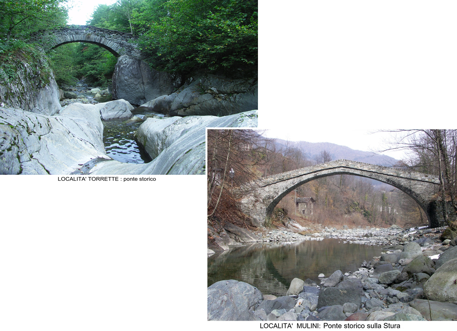 Sono uno degli elementi architettonici più caratteristici del territorio, ad una sola campata, con caratteristiche strutturali molto simili agli antichi ponti romani. Le numerose piene dei torrenti che affluiscono nella Stura di Viù ne hanno spesso la ricostruzione, avvenuta tuttavia nel rispetto dell'architettura originaria. Tra i più interessanti: quello dei Mulini Ninìn, quello delle Fucine, quello sulla vecchia mulattiera per la fraz. Venera, quello della Torretta, non lontano dalla fraz. Richiaglio, quello dei Mulini di Cramoletti.