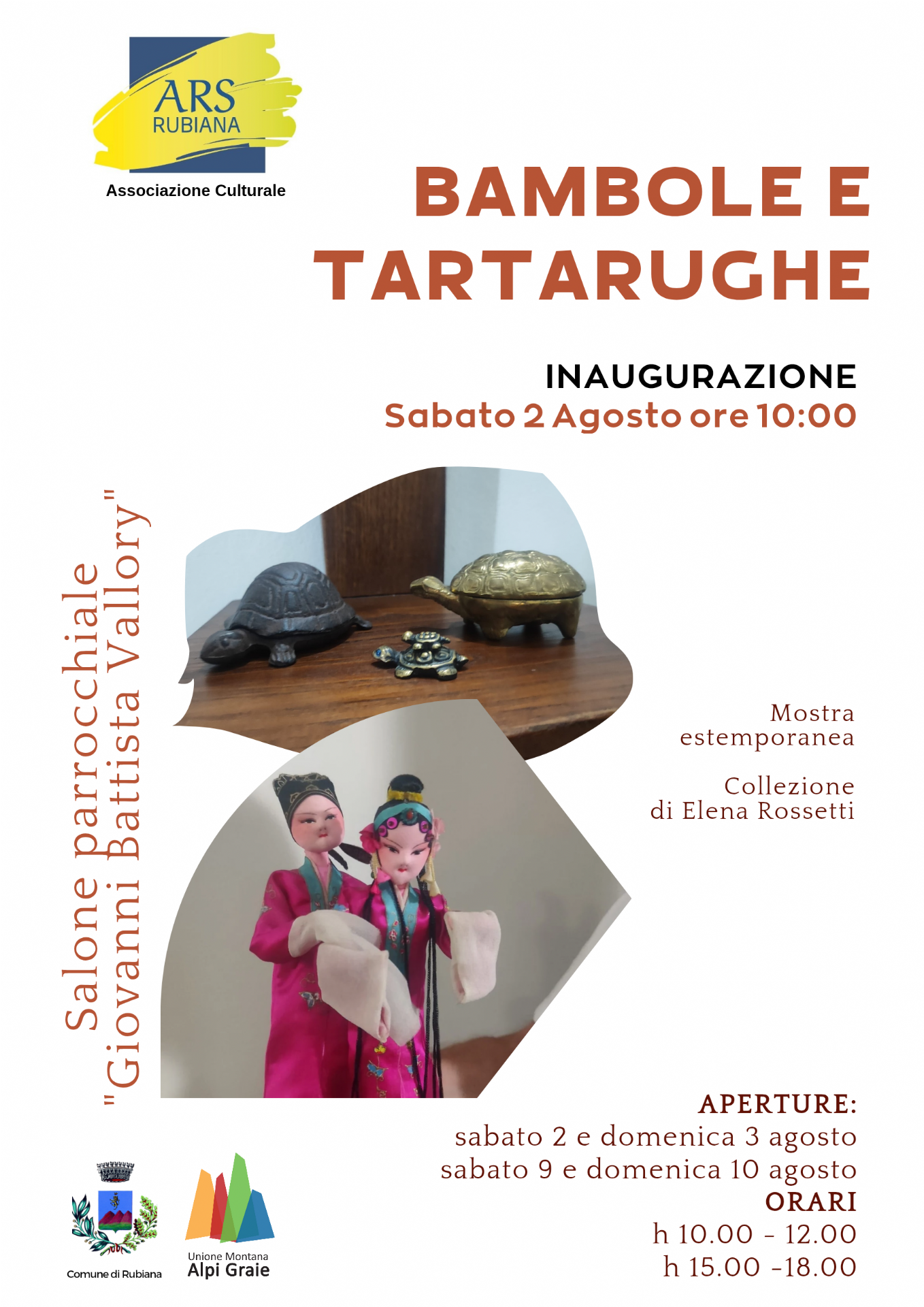 Sabato 2 agosto alle 10.00 presso il salone parrocchiale G.B.Vallory a Rubiana (TO) si terrà l'inaugurazione della mostra di oggettistica "Bambole e Tartarughe": una ollezione di Elena Rossetti.