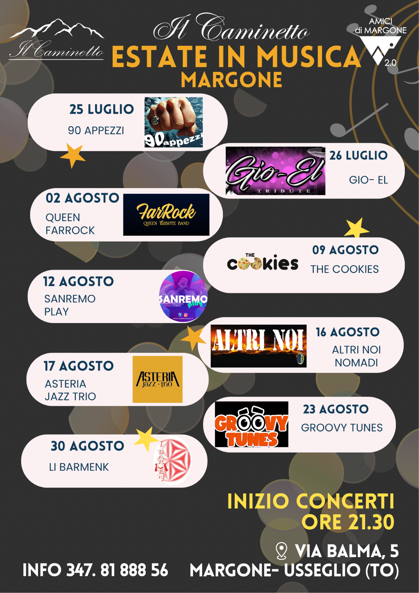 I concerti sono un momento molto atteso dell'estate a Margone, per riunirsi e cantare sotto le stelle! I gruppi coinvolti quest'anno spaziano dal rock a grandi cantautori e cantautrici della musica italiana sino ai balli francoprovenzali.
