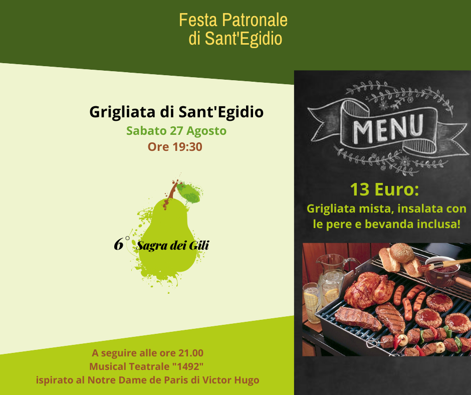 - ore 19.30: Cena con grigliata mista e insalata di Sant'Egidio: "Parigi 1482" musical teatrale ispirato a "Notre Dame de Paris" di Victor Hugo. Ingresso libero.