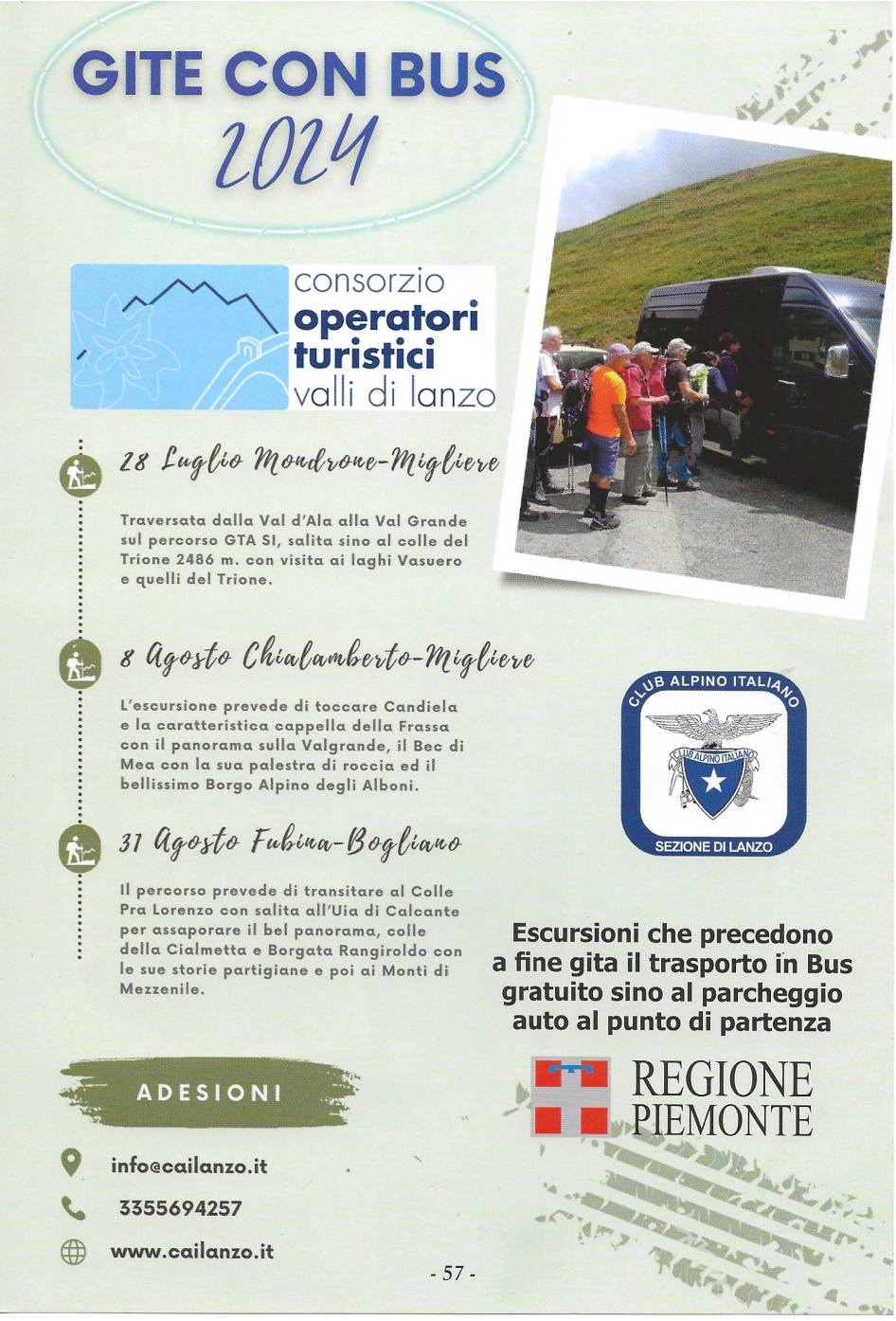Il CAI di Lanzo organizza escursioni che precedono a fine gita il trasporto in Bus gratuito sino al parcheggio auto al punto di partenza.
