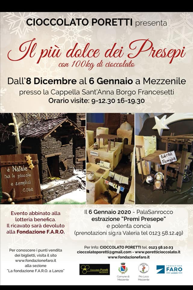 Anche quest'anno la Cioccolateria Poretti ha preparato "Il più dolce dei Presepi" che si può visitare dall'8/12 al 6/1 presso la Cappella Sant'Anna del Borgo Francesetti. Evento abbinato alla lotteria benefica il cui ricavato sarà devoluto alla Fondazione F.A.R.O.