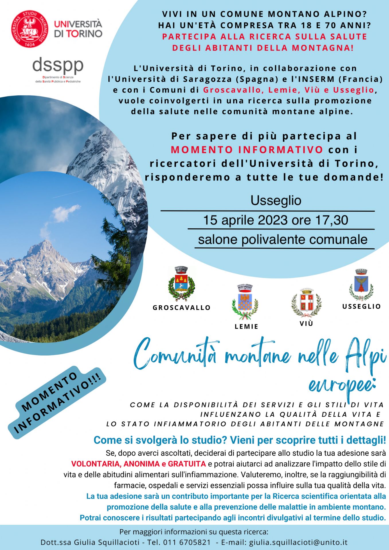 L'Università di Torino, in collaborazione con l'Università di Saragozza (Spagna) e l'INSERM (Francia) e con i Comuni di Groscavallo, Lemie, Viù e Usseglio, vuole coinvolgerti in una ricerca sulla promozione della salute nelle comunità montane alpine.