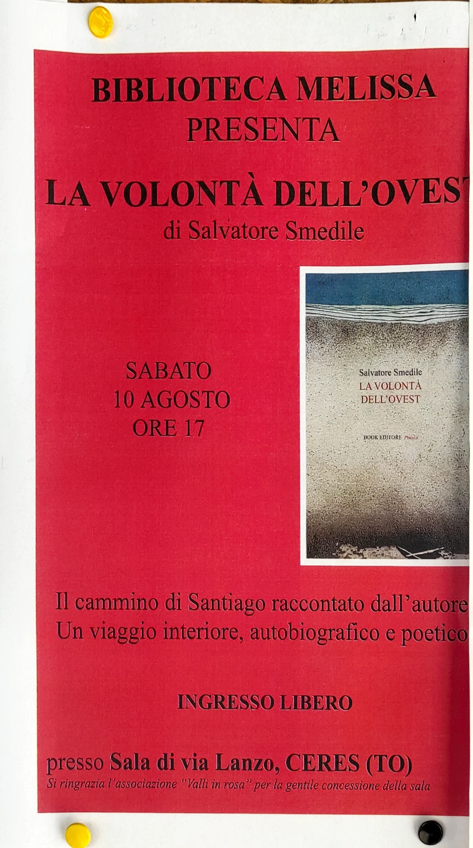 Sabato 10 agosto la Biblioteca Melissa presenta alle ore 17,00 "LA VOLONTA' DELL'OVEST" di Salvatore Smedile presso la Sala di Via Lanzo, Ceres.