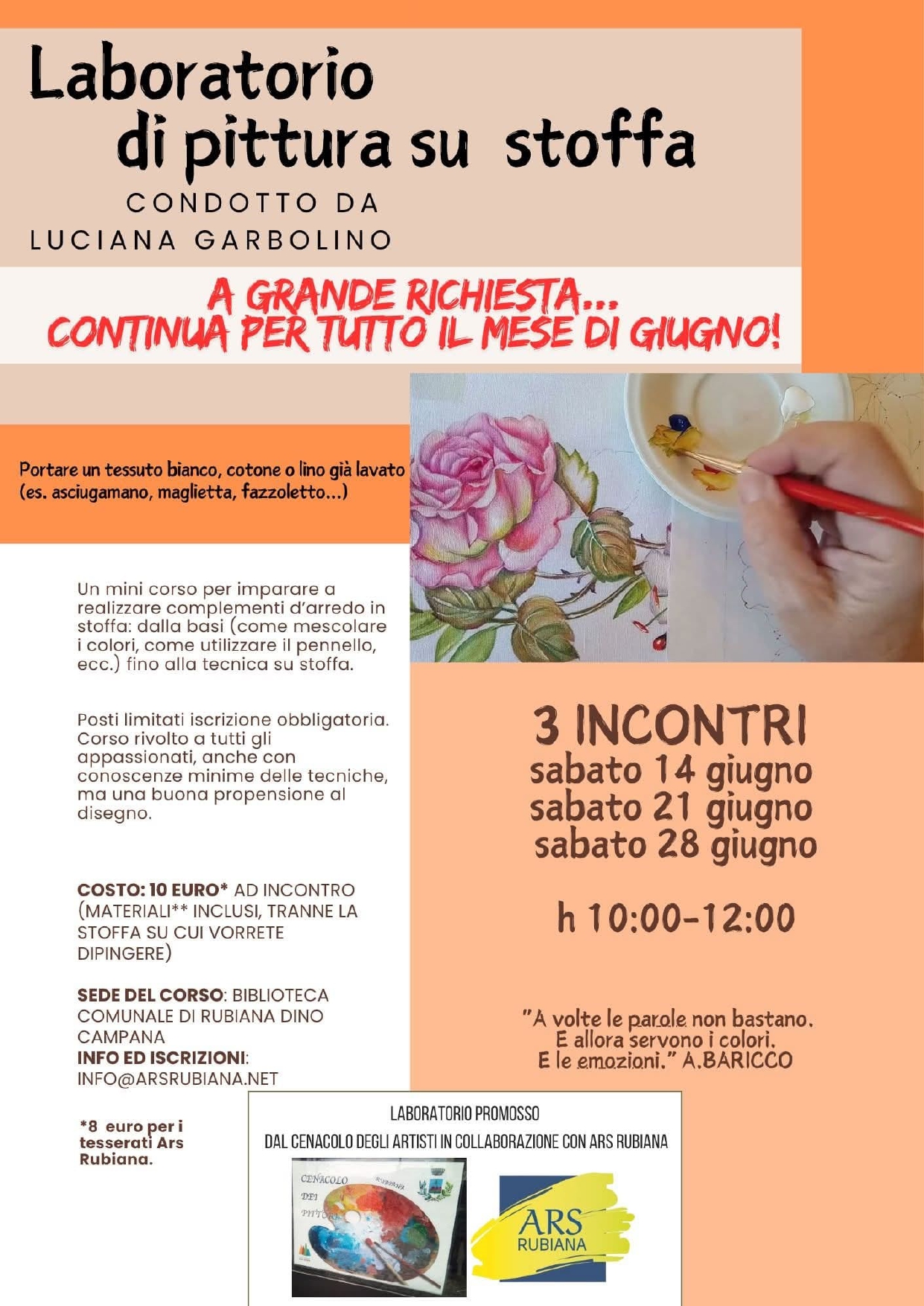 Costo: 10 € ad incontro - 8 € per i tesserati Ars Rubiana (materiali inclusi tranne la stoffa che si desidera dipingere)