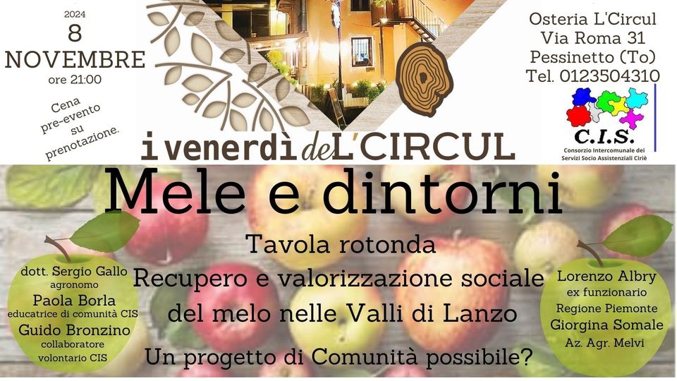 La rassegna I Venerdì de L'Circul è lieta di ospitare una serata in cui si parlerà di MELE E DINTORNI Passato, presente e futuro dell’agricoltura di montagna. Un viaggio nel mondo della coltivazione delle mele nel comune di Coassolo e dintorni dagli anni d’oro ad oggi con i commenti di coltivatori, ex coltivatori ed esperti del settore. Un primo incontro per conoscere, confrontarsi, costruire comunita’.