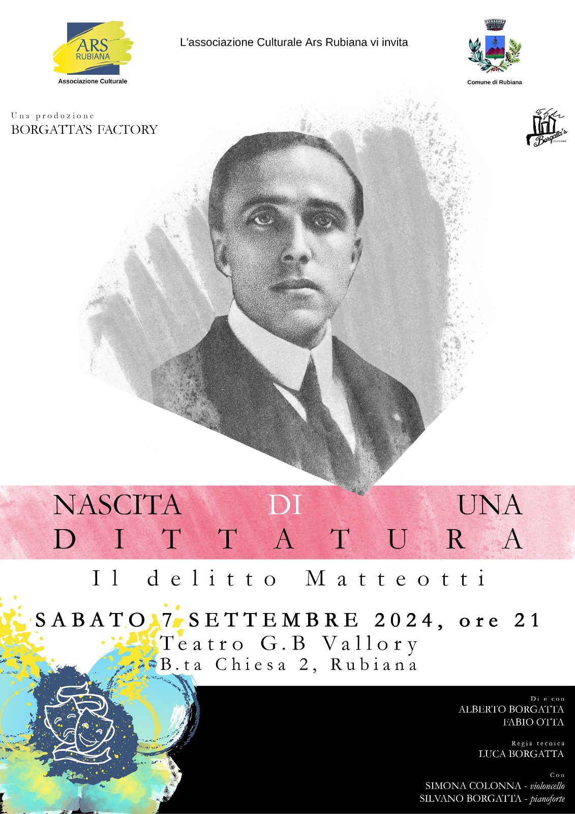 Sabato 7 settembre alle ore 21.00, in occasione dei cento anni dal delitto Matteotti, 𝐁𝐨𝐫𝐠𝐚𝐭𝐭𝐚'𝐬 𝐅𝐚𝐜𝐭𝐨𝐫𝐲, in collaborazione con l'Associazione 𝐀𝐫𝐬 𝐑𝐮𝐛𝐢𝐚𝐧𝐚, vi invita a rivivere i giorni drammatici che segnarono, per il popolo italiano, la perdita - di fatto - della propria libertà civile e morale.