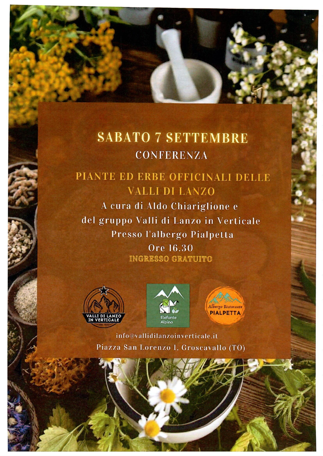 Sabato 14 settembre alle ore 16,30 avrà luogo la conferenza 'PIANTE ED ERBE OFFICINALI DELLE VALLI DI LANZO' - a cura di Aldo Chiariglione e del gruppo Valli di Lanzo in Verticale, presso l'Albergo Pialpetta.