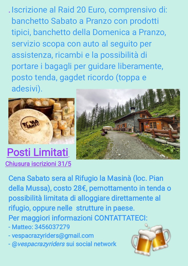 Iscrizione al raid 20€, comprensivo di: banchetto sabato a pranzo con prodotti tipici, banchetto della domenica a pranzo, servizio scopa con auto al seguito per assistenza, ricambi e la possibilità di portare bagagli per guidare liberamente, posto tenda, gadget ricordo (toppa e adesivi).