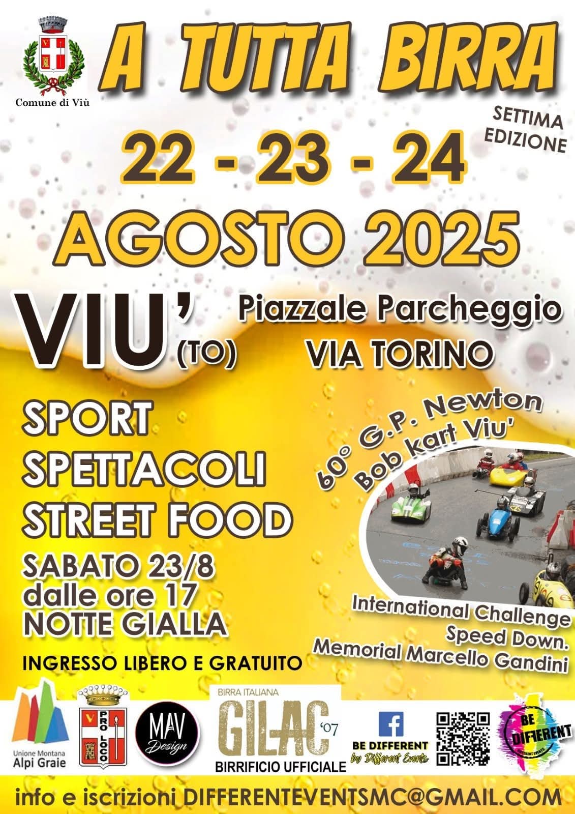 - Bob Kart Viù e G.P. Newton: Sabato 23 agosto dalle 17:00, si terrà una sfida internazionale di Bob Kart, un’emozionante competizione di velocità in discesa, in memoria di Marcello Gandini.