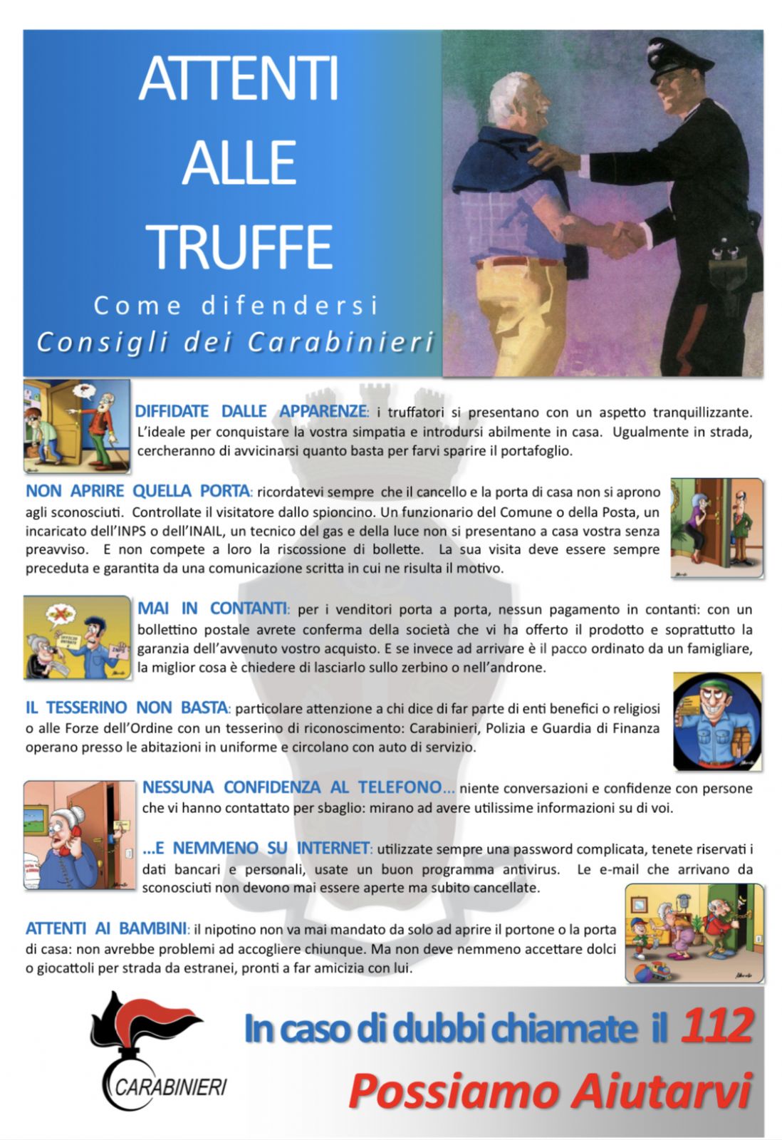 Alle ore 16,15 presso il salone polivalente comunale si terrà un incontro informativo con l'Arma dei Carabinieri - stazione di Viù al fine di informare l popolazione su come difendersi dalle truffe.