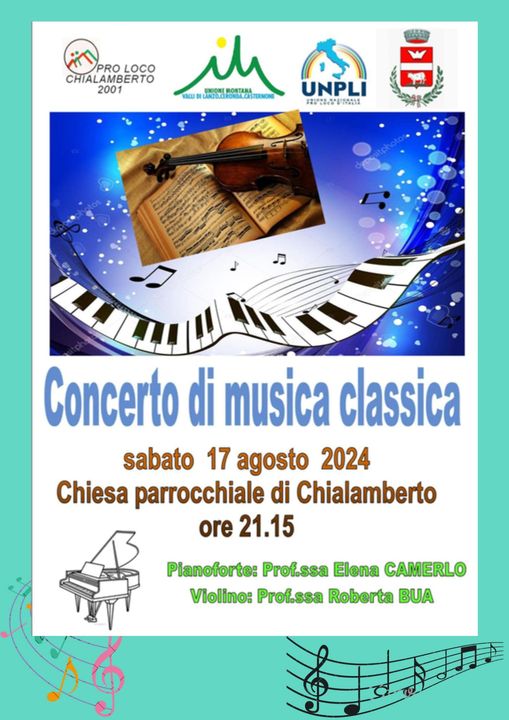 Sabato 17 agosto viene organizzato un 'CONCERTO DI MUSICA CLASSICA' presso la Chiesa Parrocchiale di Chialamberto alle ore 21,15.