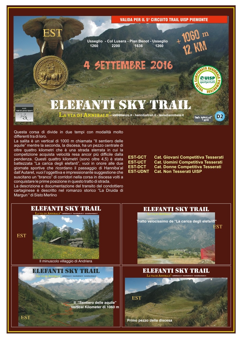 La corsa dei 12 km, “Elefanti Sky Trail” presenta al suo interno due aspetti caratteristici e distinti l’uno dall’altro. Appena dopo la partenza, inizia un Vertical Kilometer, di 1060 m di dislivello e lungo 5,5 km che porta al Col Lusera. Questa salita detta “Il sentiero delle aquile” diventa poi, dal colle in giù, uno Sky Trail di oltre 5 km. Questo tratto è stato battezzato “La carica degli elefanti”, vuoi in onore alle due giornate sportive che ricordano il passaggio di Hanniba’al dall’Autaret (3071 m), vuoi l’oggettiva e impressionante suggestione che suscitano un “branco” di corridori nella corsa in discesa volti a conquistare le prime posizioni in questo tratto favorevole.