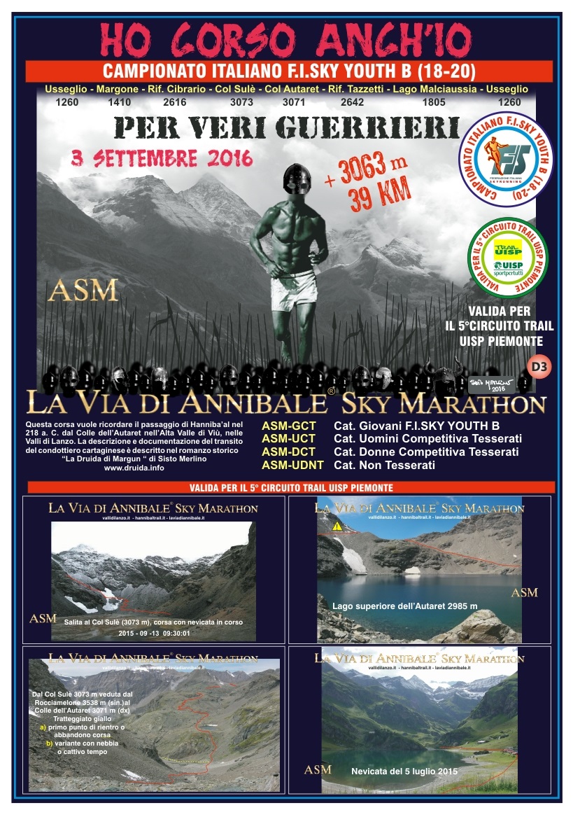 Il percorso “La via di Annibale®” Sky Marathon (ASM) è classificato con il bollino rosso: EE itinerario per escursionisti esperti. Si snoda prevalentemente su strade forestali, mulattiere e sentieri in quota. E’ un itinerario che richiede la capacità di muoversi su terreni particolari, tracce o sentieri impervi o infidi (pendii con affioramenti rocciosi o detritici), talora impegnativi ed esposti. Con due colli oltre i 3000 m, attraversamento di nevai e i resti del ghiacciaio Berta. Sono possibili nevicate durante la gara che seppur relativamente breve ha un alto fascino tecnico e paesaggistico. Il percorso segue il seguente itinerario: Usseglio 1260, Margone 1410, Rifugio Cibrario 2616, Colle Sulè 3073, Colle Autaret 3071, Rifugio Tazzetti 2642, Lago di Malciussia /rifugio Vulpot 1805, Usseglio 1260.