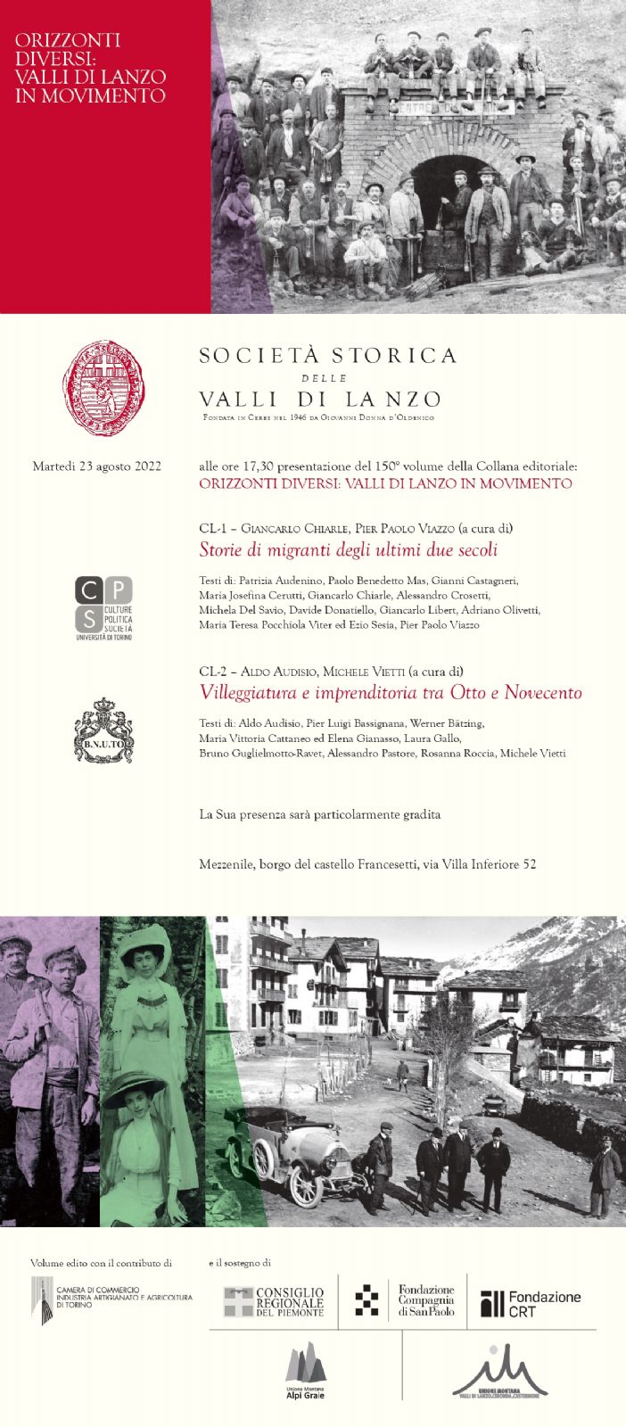 Il volume raccoglie gli atti dei due convegni realizzati nel 2021 nell’ambito del progetto "Orizzonti diversi: Valli di Lanzo in movimento", per festeggiare il 75° anniversario di fondazione dell’associazione. la pubblicazione è a cura di Giancarlo Chiarle, Pier Paolo Viazzo, Aldo Audisio e Michele Vietti.