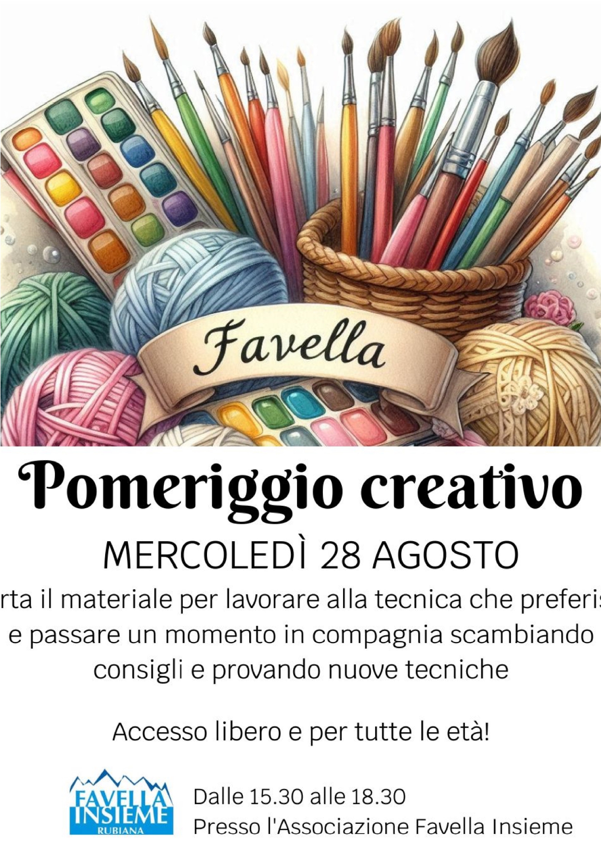 Mercoledì 28 agosto l'Associazione Favella Insieme organizza 'POMERIGGIO CREATIVO' dalle 15,30 alle 18,30 presso la sede dell'associazione.