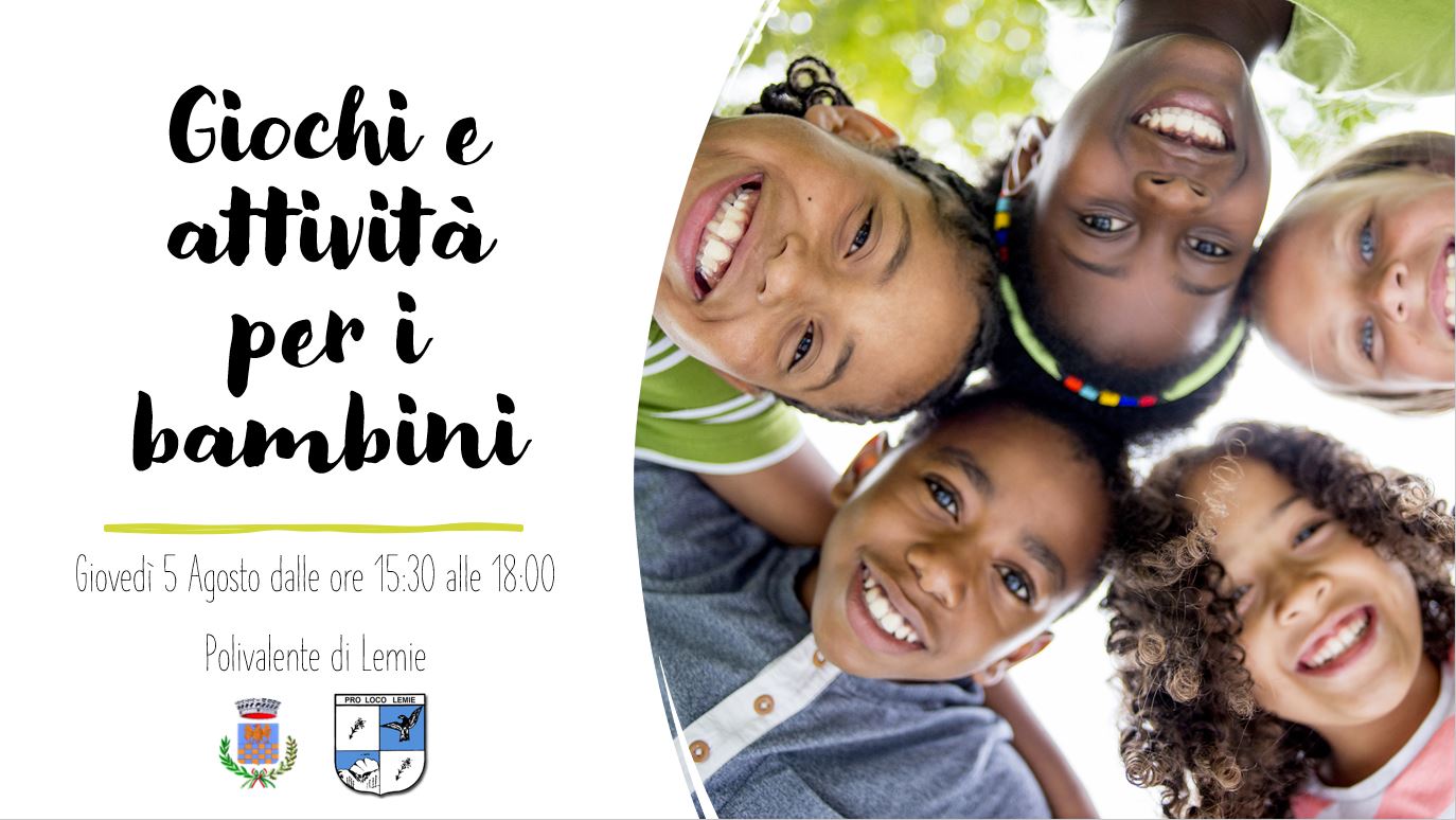 Dalle 15:30 alle 18:00 presso l'area sportiva di Lemie, di fronte al campo polivalente, i vostri bimbi dai 4 ai 10 anni si potranno divertire insieme a noi con giochi e attività di intrattenimento!
