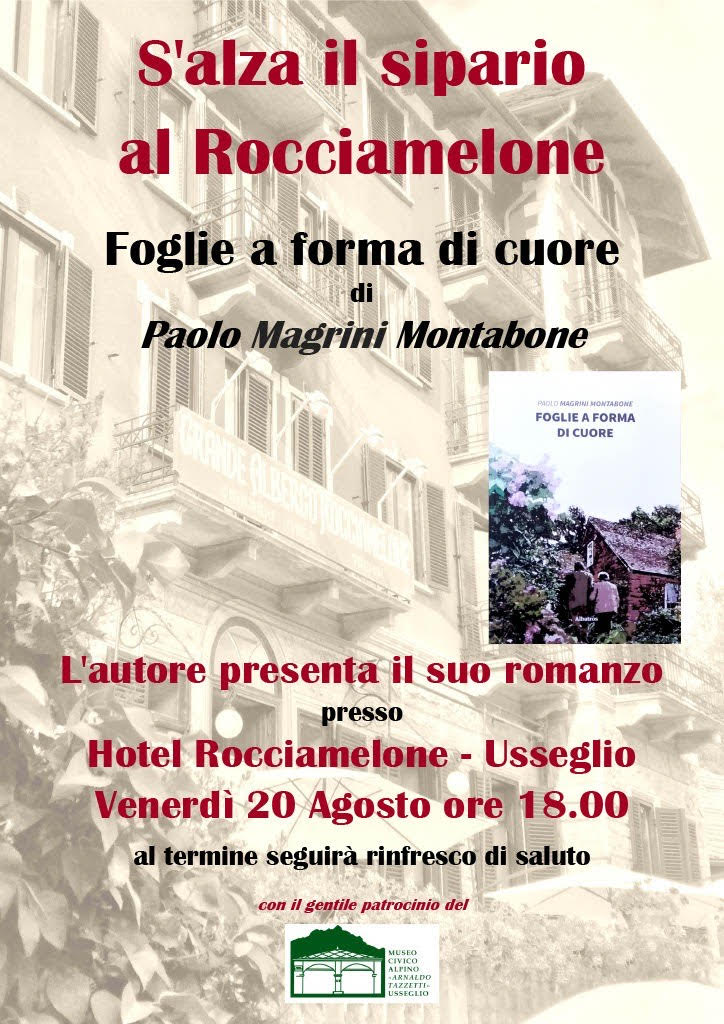 Paolo Magrini Montabone presenta il suo nuovo romanzo "Foglie a forma di cuore" presso l'Albergo Rocciamelone di Usseglio (Via Roma, 37, 10070 Usseglio TO). Vi aspettiamo venerdì 20 agosto alle ore 18. Al termine seguirà un rinfresco di saluto.