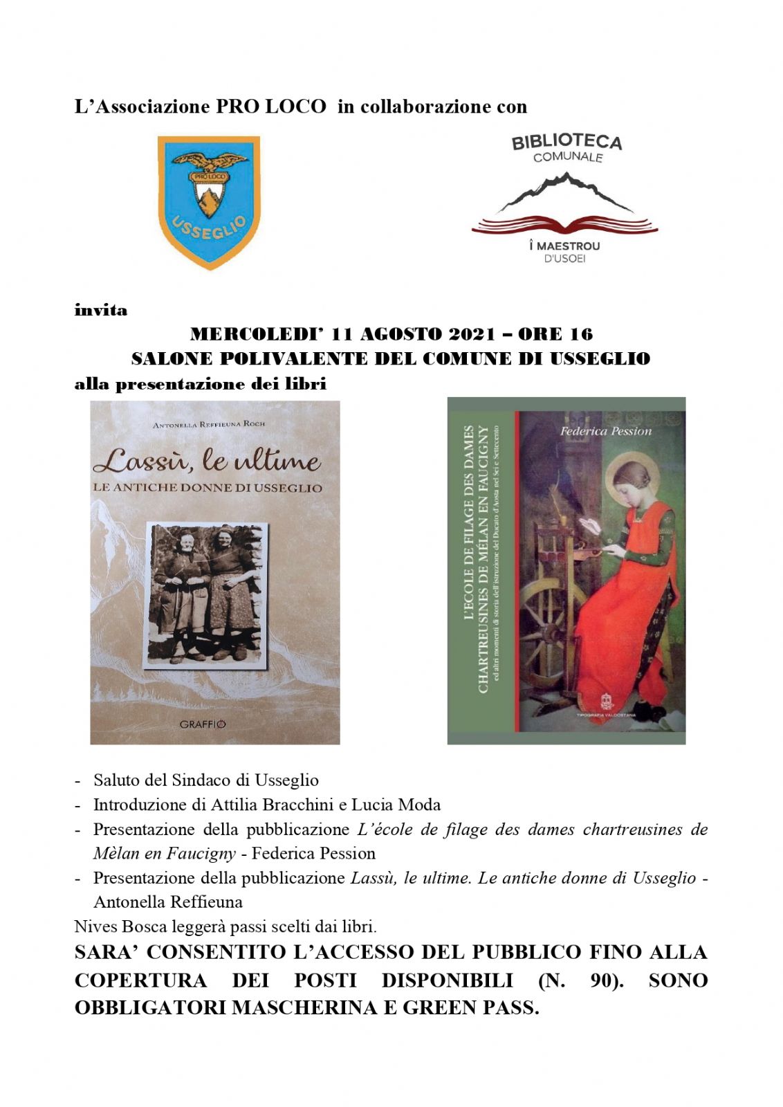 Mercoledì 11 agosto alle ore 16 siete invitate/i nel Salone polivalente di Usseglio alla presentazione dei libri L'école de filage des dames chartreusines de Mélan en Faucigny di Federica Pession e Lassù, le ultime. Le antiche donne di Usseglio di Antonella Reffieuna Roch.