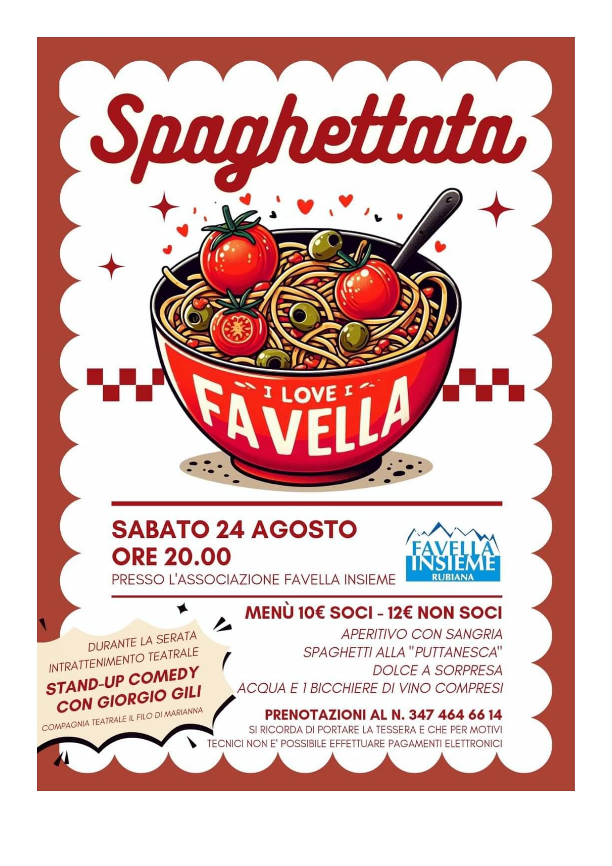 Sabato 24 agosto l'Associazione Favella Insieme organizza la 'SPAGHETTATA' presso la sede dell'associazione.