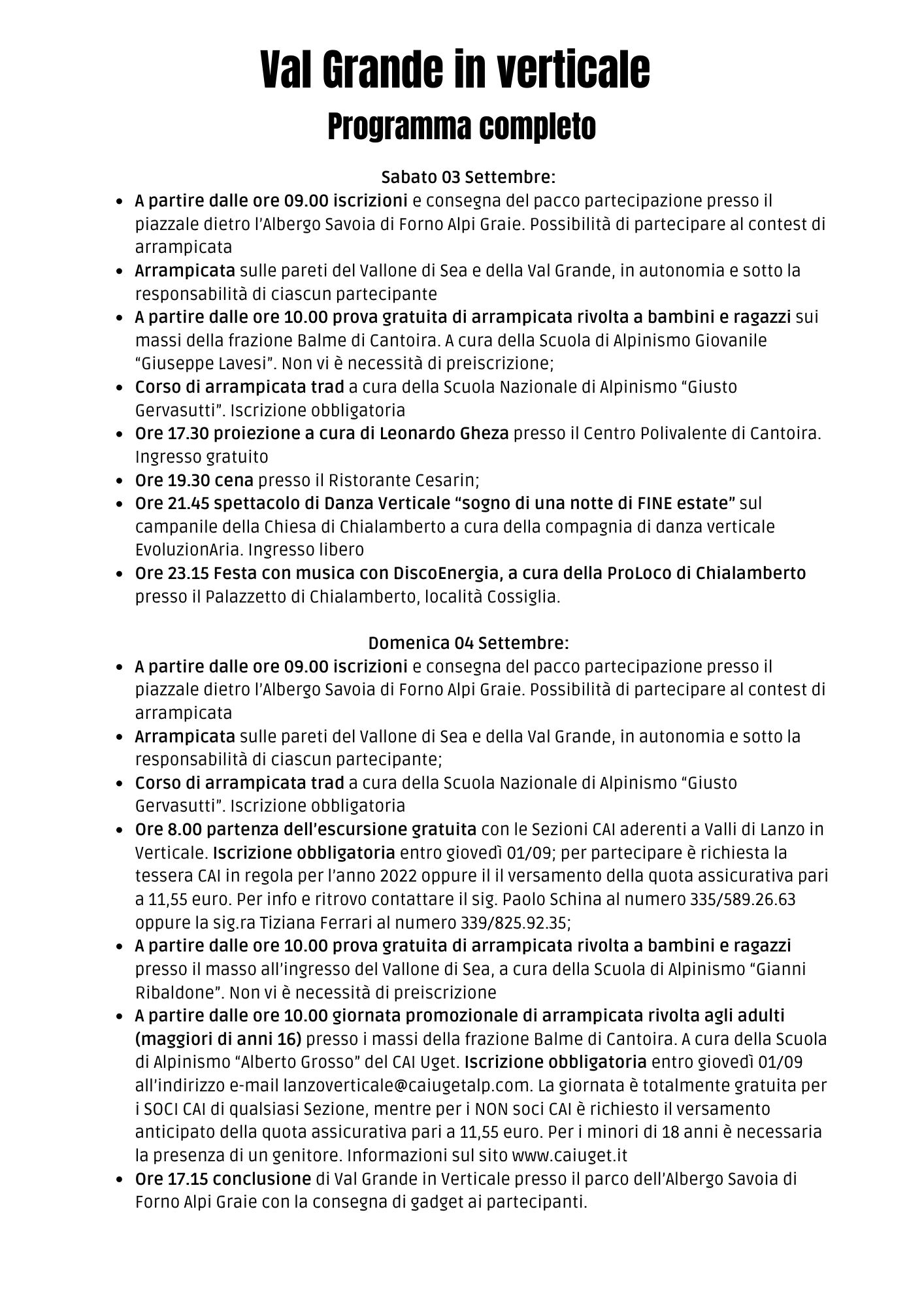- Ore 17.15 conclusione di Val Grande in Verticale presso il parco dell’Albergo Savoia di Forno Alpi Graie con la consegna di gadget ai partecipanti.