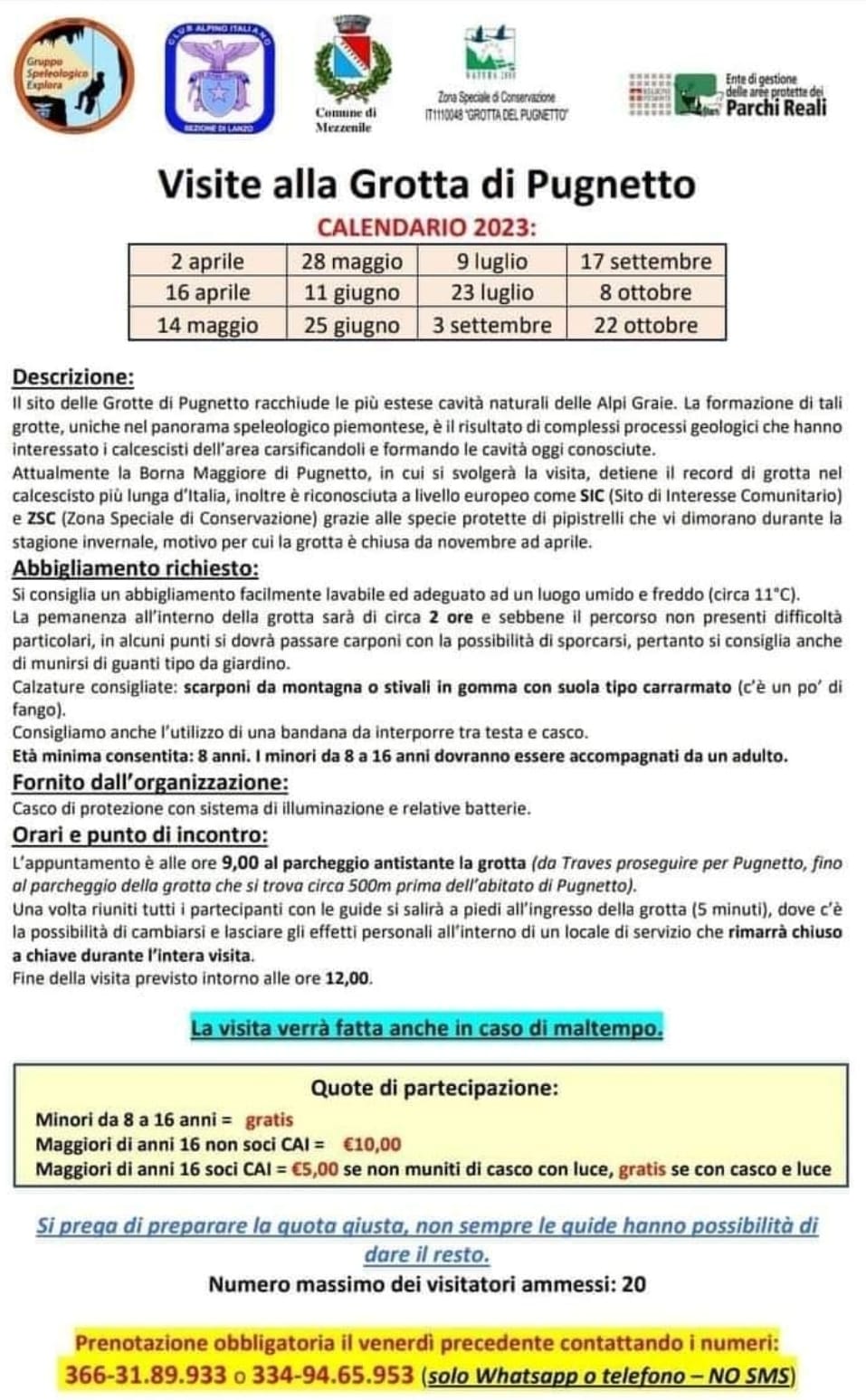 Si consiglia un abbigliamento adatto a una zona fredda e umida e scarponi da montagna o stivali di gomma. Casco e torcia saranno fortniti dall'organizzazione. I partecipanti si ritroveranno alle ore 9 presso il piazzale delle grotte. La fine dell'attività è prevista per le ore 12.00.