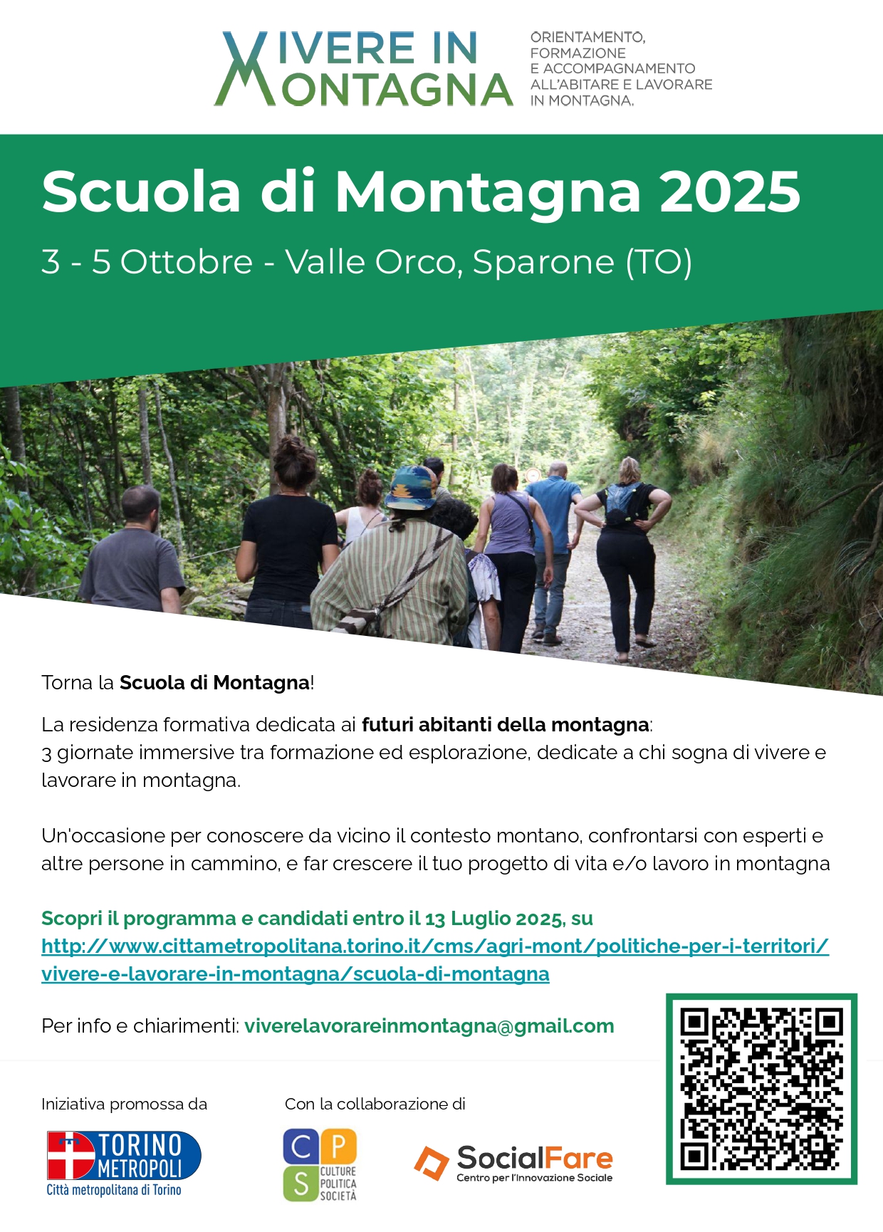 L’iniziativa è promossa da Città Metropolitana di Torino nell’ambito del progetto Vivere in montagna, in collaborazione con il Dipartimento di Culture, Politica e Società dell’Università degli Studi di Torino e SocialFare | Centro per l’Innovazione Sociale.